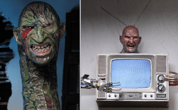 A Nightmare on Elm Street action figures “deluxe accessory pack” by NECA features a Freddy Worm, a Freddy TV, and two Elm Street signs, all to scale to fit with …
